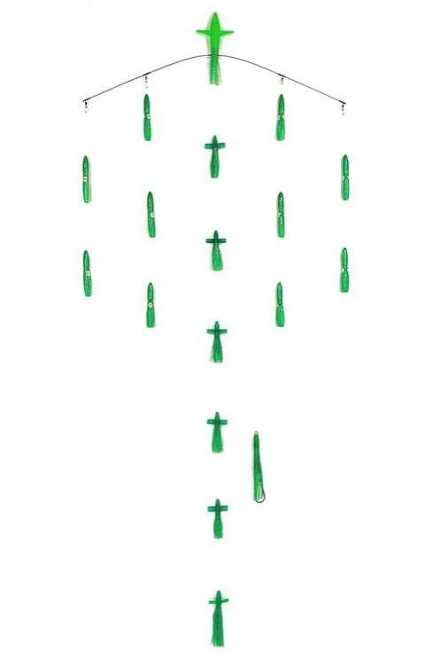 Named for the heavy surface commotion and noisy racket it produces, the Sterling Tackle 36in Chaos Bar w/ 6in Bulb Squid is one of the deadliest straight running spreader bars on the market. Built on a .125 inch diameter high grade titanium bar, these pre-rigged spreader bars are loaded with the perfect combination of soft birds, squid, and rigged stinger to attract pelagics like tuna, dolphin, billfish, and more to your spread. The center line is loaded with six 5 inch soft rattling birds for extra noise and surface splash, while the wing lines feature a total of ten 6 inch bulb squids to simulate schooling bait. The rear squids are even fitted with rattles of their own to really ramp up the noise factor. Inside the bottom teaser bird is a 400lb stainless bearing swivel used to attach the 9in Mini-Machine Stinger rigged with tri-beads and a 9/0 4x strong knife edge big game hook. The center line is rigged with 250lb smoke blue Momoi monofilament, while the wing lines are rigged with 200lb. Loop protectors are used on all critical connection points. Each spreader bar comes with its on clear vinyl/mesh lure bag for easy storage and wash down.